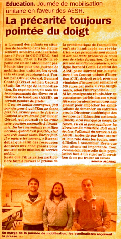 Mercredi 4 novembre 2015, les organisations syndicales FERC-CGT, SUD-Éducation, FNEC-FP-FO et FAEN ont organisé une journée nationale de mobilisation en faveur des personnels qui accompagnent les élèves en situation en handicap (AESH). A cette occasion, plusieurs rassemblements ont été organisés (Rennes, Toulouse, Clermont-Ferrand...), d'autres le seront dans les prochains jours (Perpignan, Dijon...). Localement, des sections syndicales de la FSU, du SE-UNSA, du SGEN-CFDT et de la CNT se sont jointes à l'action.